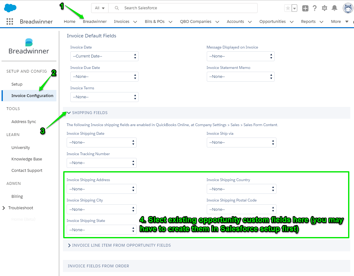 Once you have those shipping fields, map them in the Breadwinner Invoice Configuration Section. This screenshot shows how to do this.